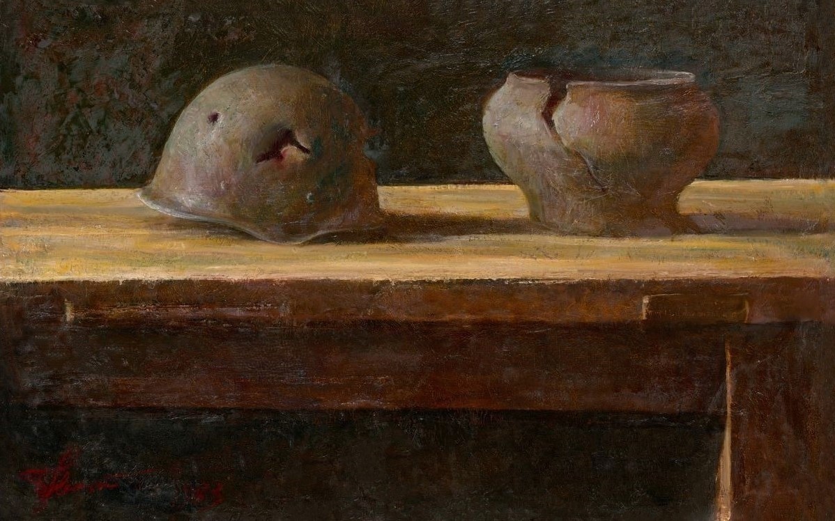 Владимир Соскиев родился 14 января 1941 года в селе Сурх-Дигора в семье крестьянина. Отец Борис Налукович погиб в первые дни Великой Отечественной. Мать Софья Михайловна одна растила двух сыновей в тяжелые военные и послевоенные годы. Тема памяти о войне оживает для скульптора через прикосновение к дорогим для него предметам. Он создает натюрморт из военных атрибутов: каски, шинели отца, свисающей со спинки стула, а плод граната – символ жертвенности и надежды на воскрешение и бессмертие. Камерные молчаливые образы поражают торжественностью интонации.